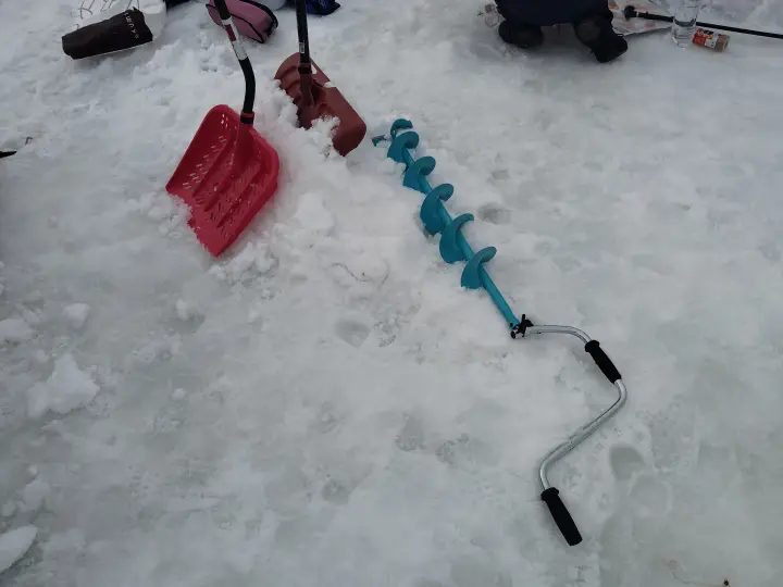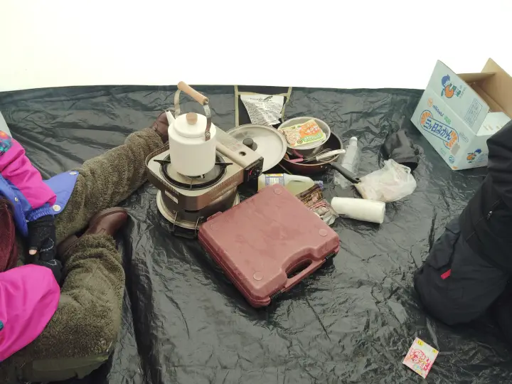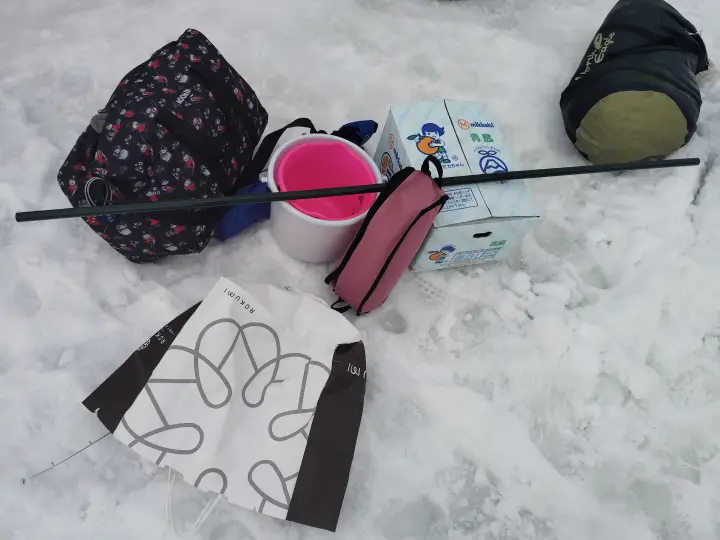 Here are some tools that we prepared in order to join this ice-fishing event. Not only the small fishing rods and baits, but also hand-drill, folding chairs, and of course, tent.