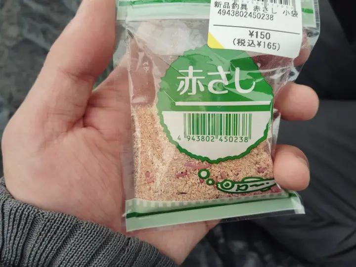 These are the type of bait that we used, akasashi, a type of live fishing bait commonly used in Japan, especially for smelt (wakasagi) ice fishing. It is the red-colored larva of midges (chironomid larvae), valued for its bright color and strong scent, which effectively attracts fish in cold water conditions. It costed only 150 yen (1US$) for one small pouch full of live Akasashi!